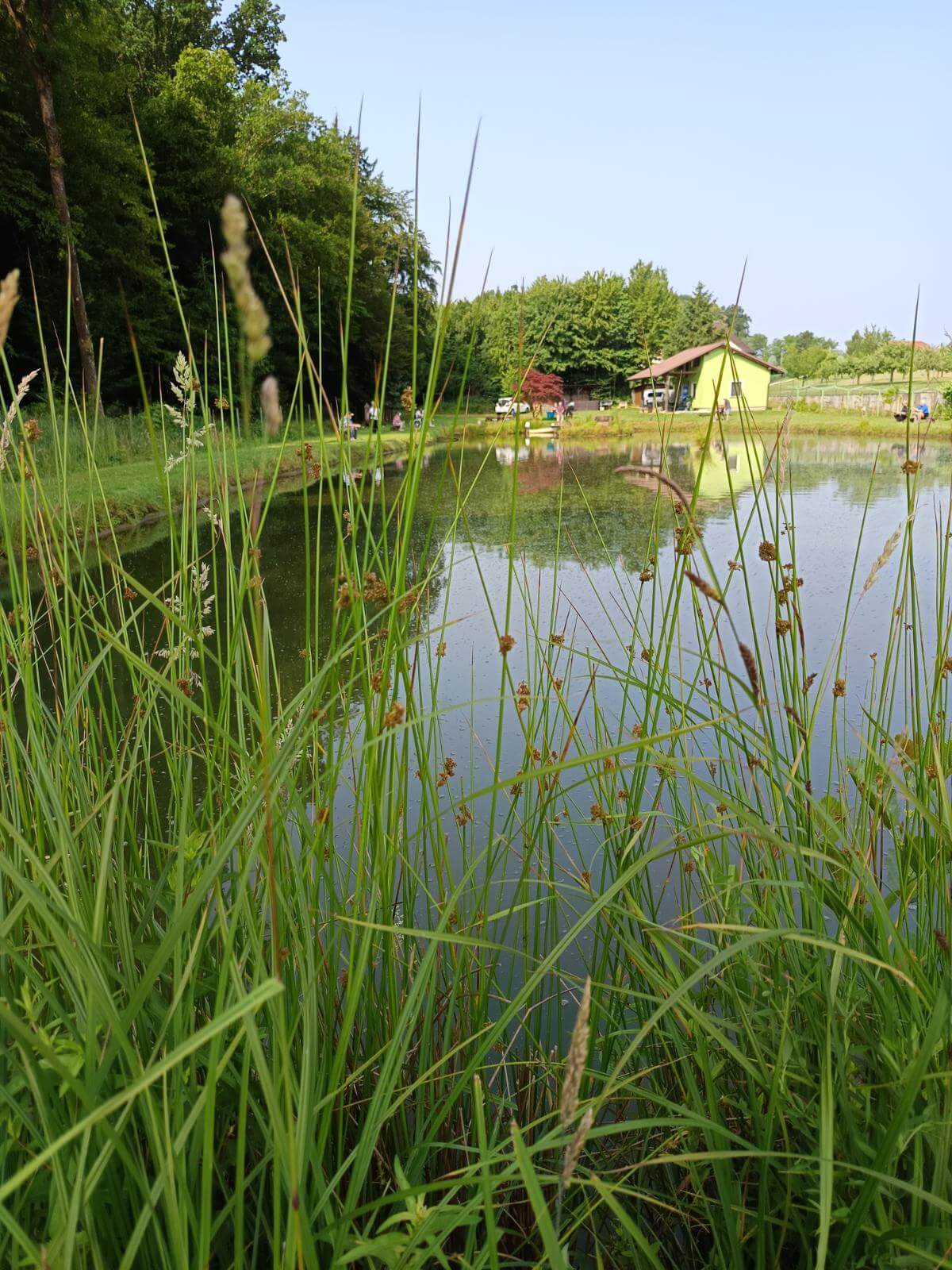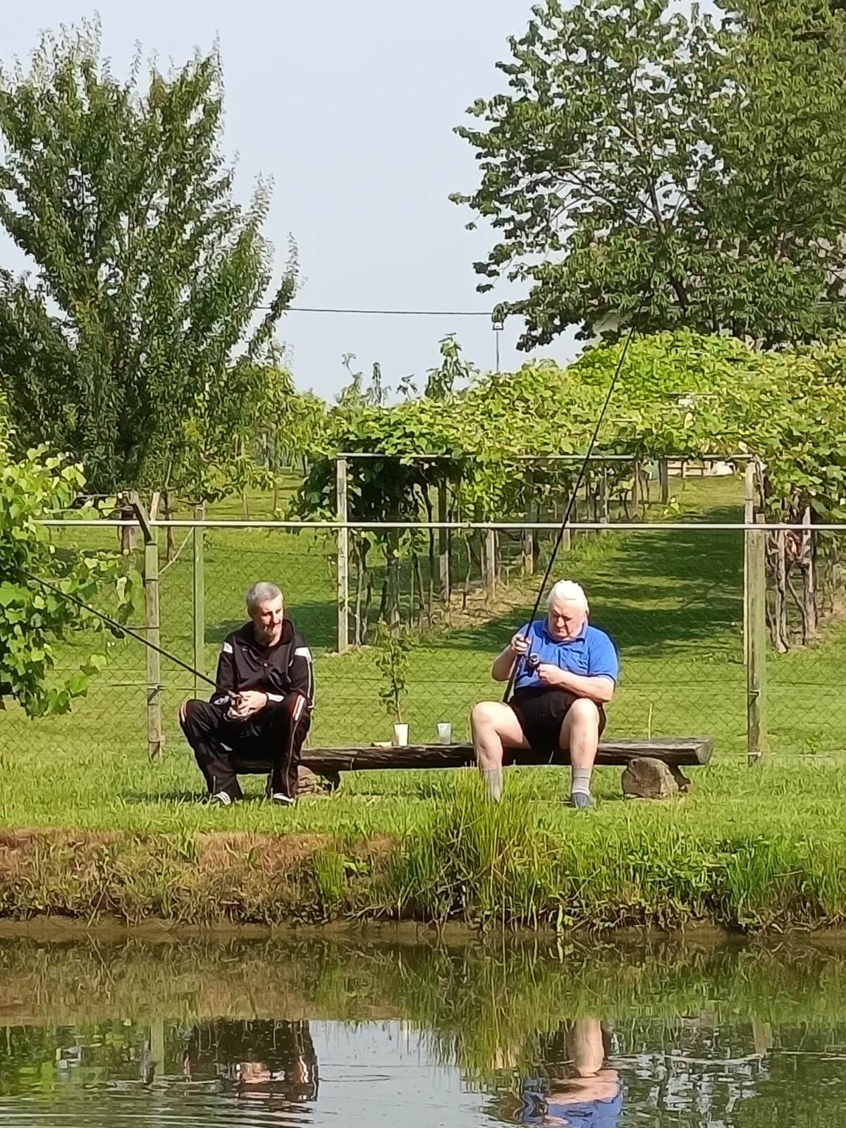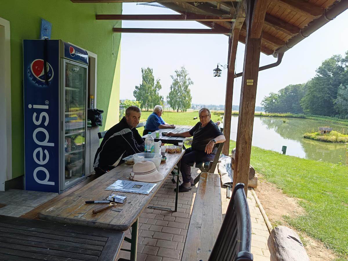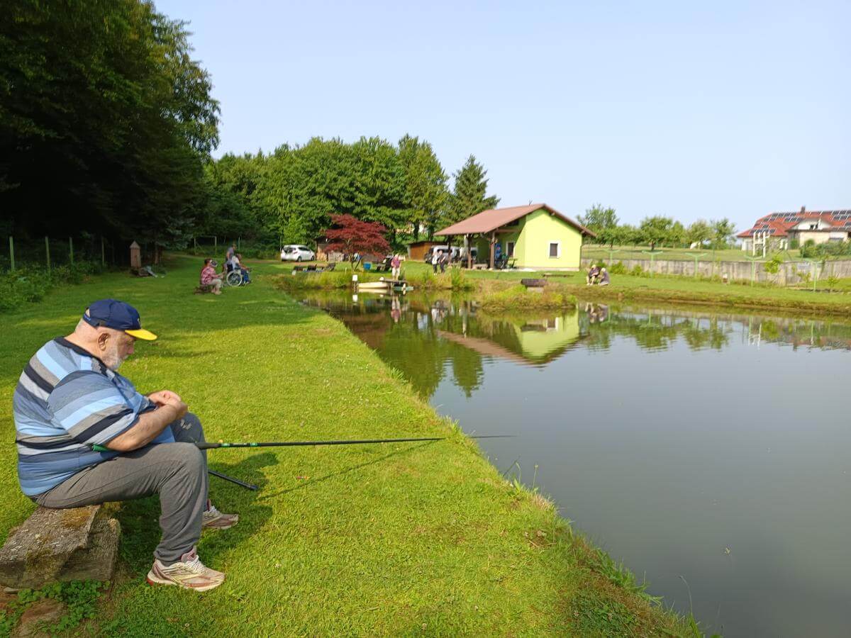 Ribiči molče namakajo svoje trnke, sliši se samo kakšen pljusk ribe na površini ribnika.