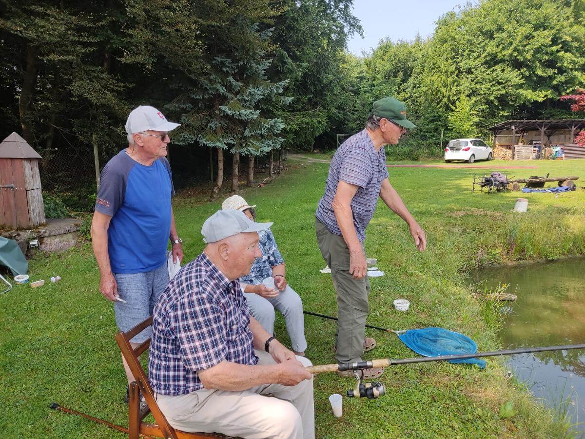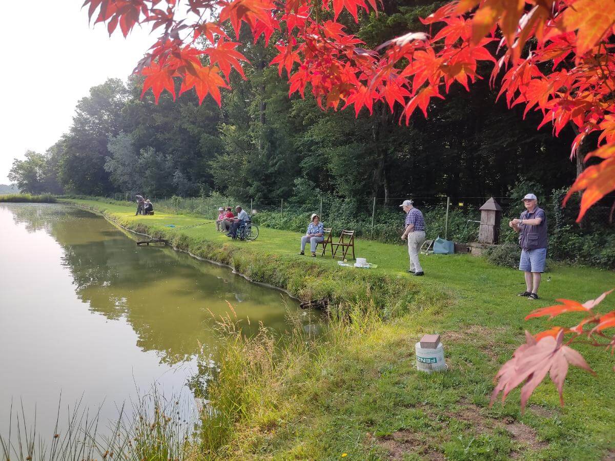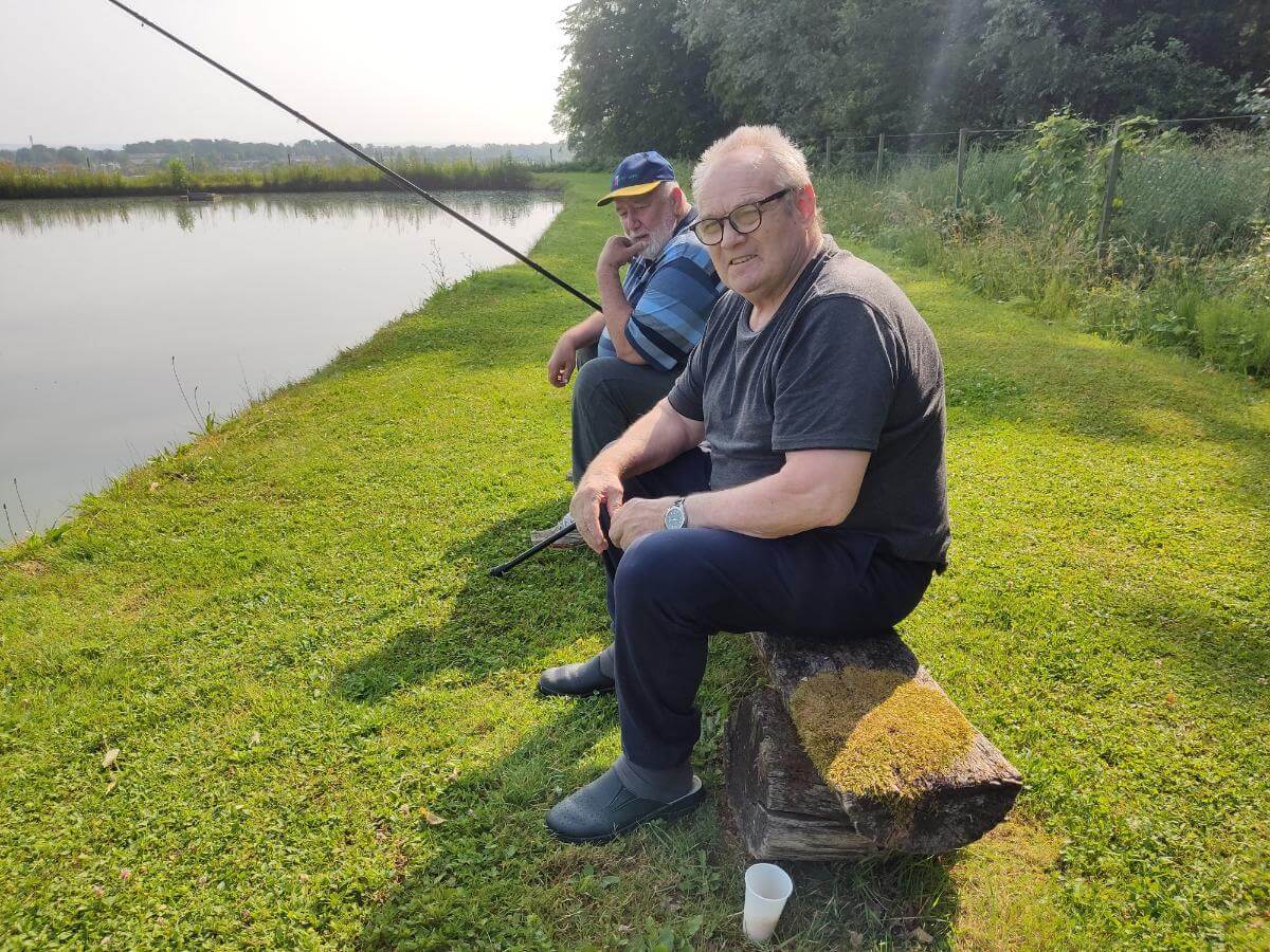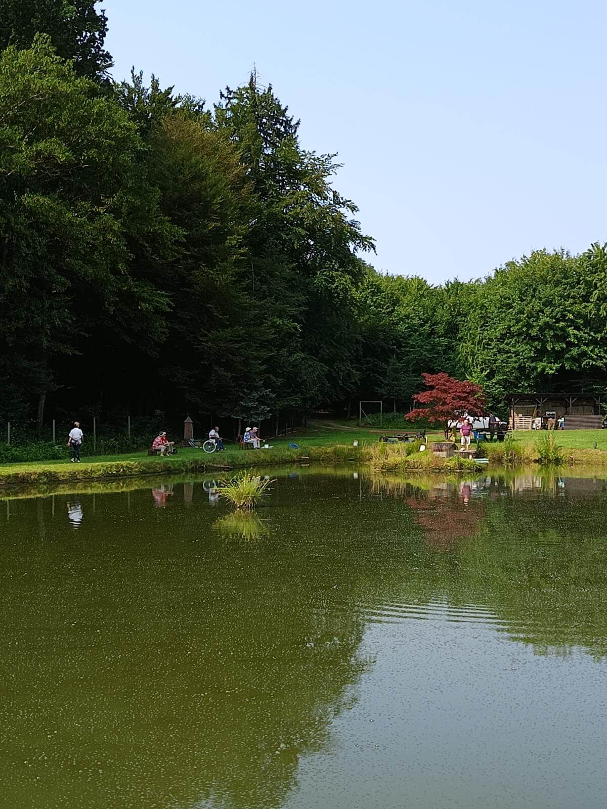 Ribiči molče namakajo svoje trnke, sliši se samo kakšen pljusk ribe na površini ribnika.