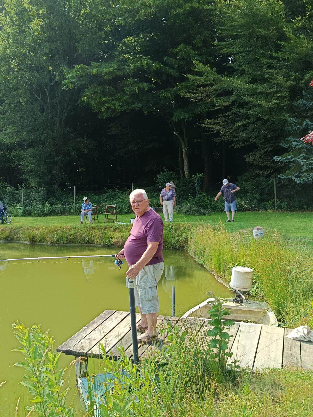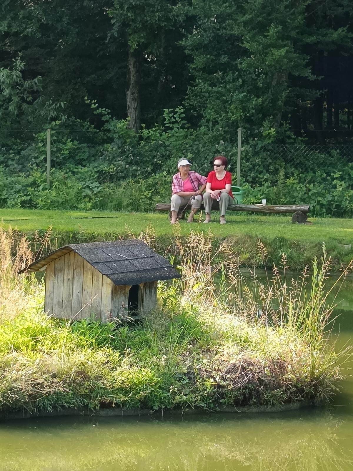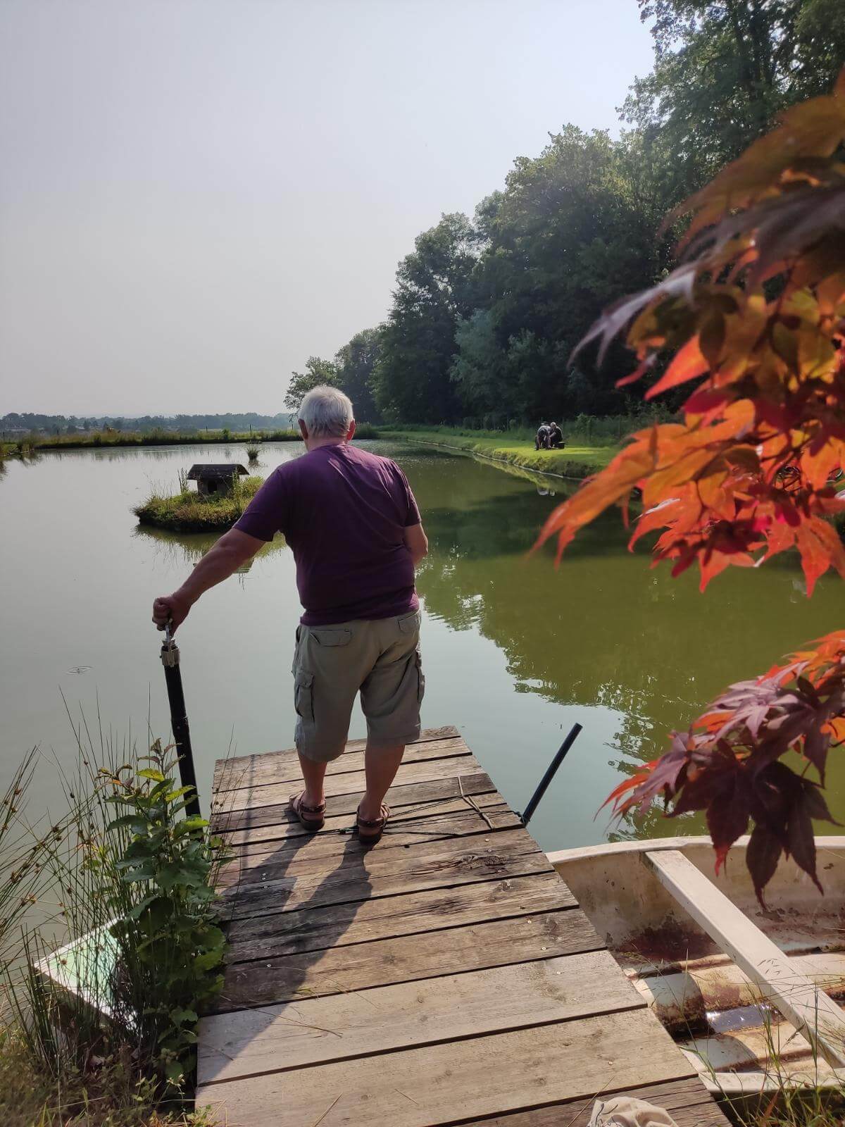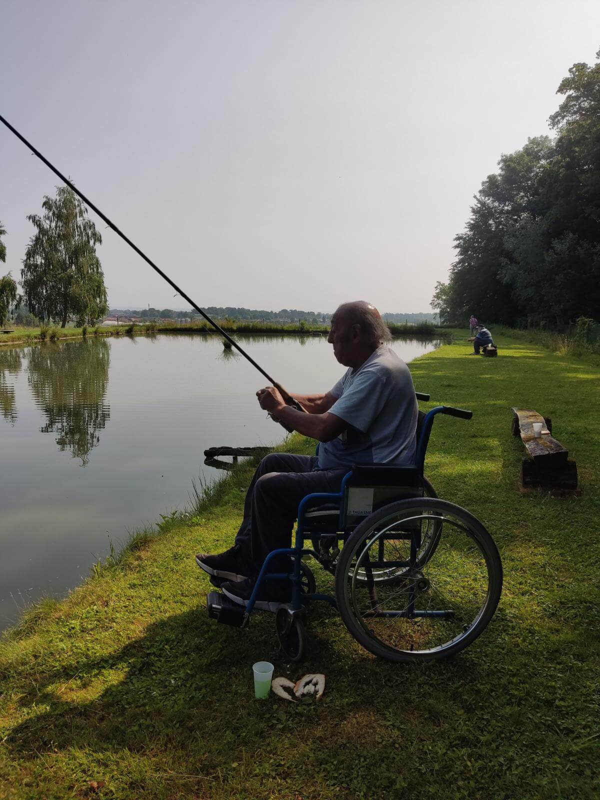 Ribiči molče namakajo svoje trnke, sliši se samo kakšen pljusk ribe na površini ribnika.